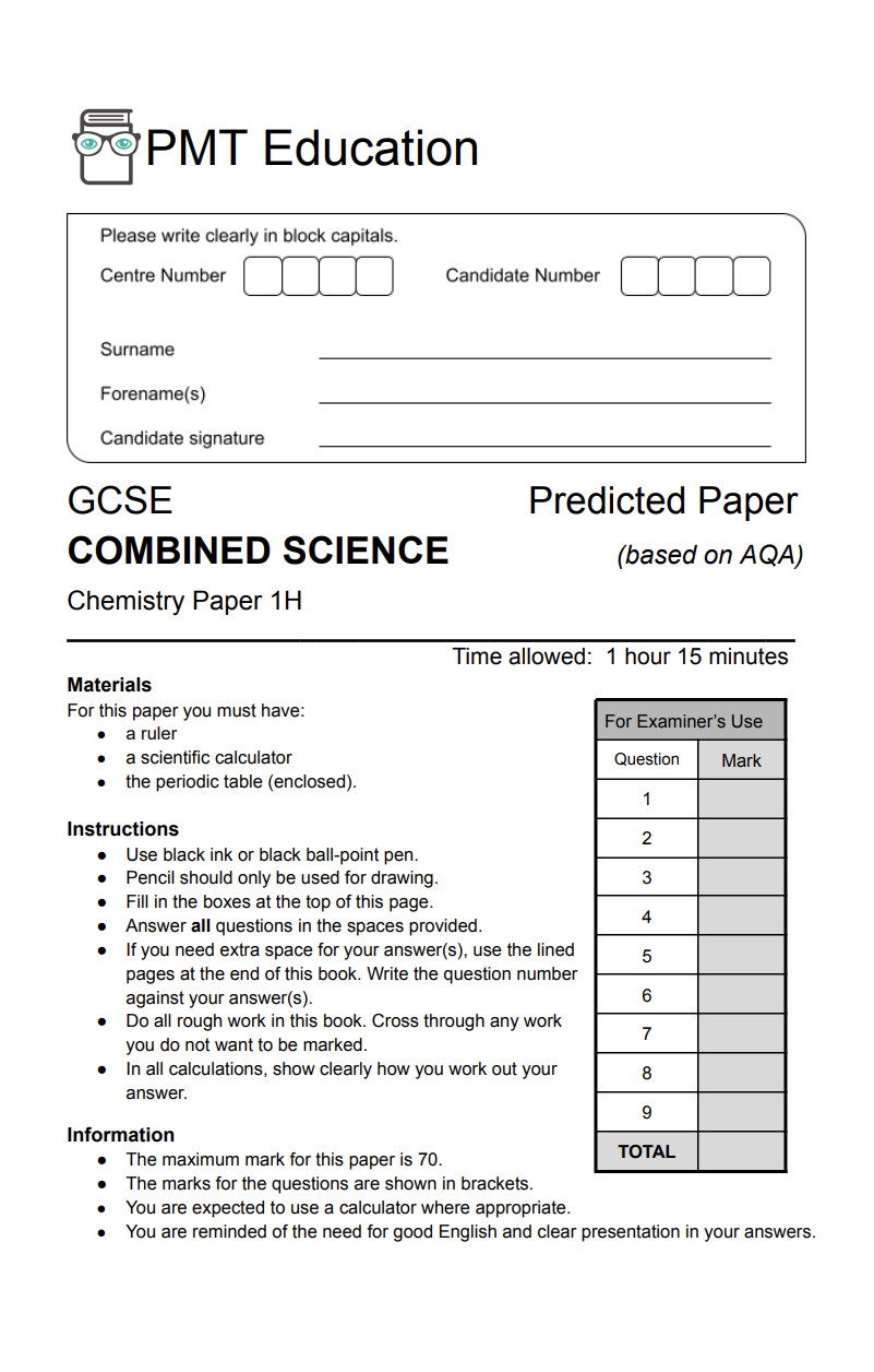 • Chemistry Paper 1 (H) Predicted Paper – AQA Combined Science GCSE 2025