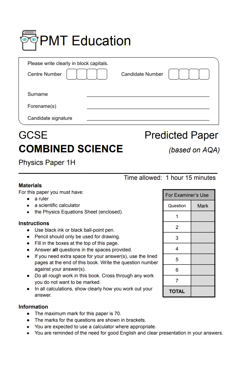 • Physics Paper 1 (H) Predicted Paper – AQA Combined Science GCSE 2025